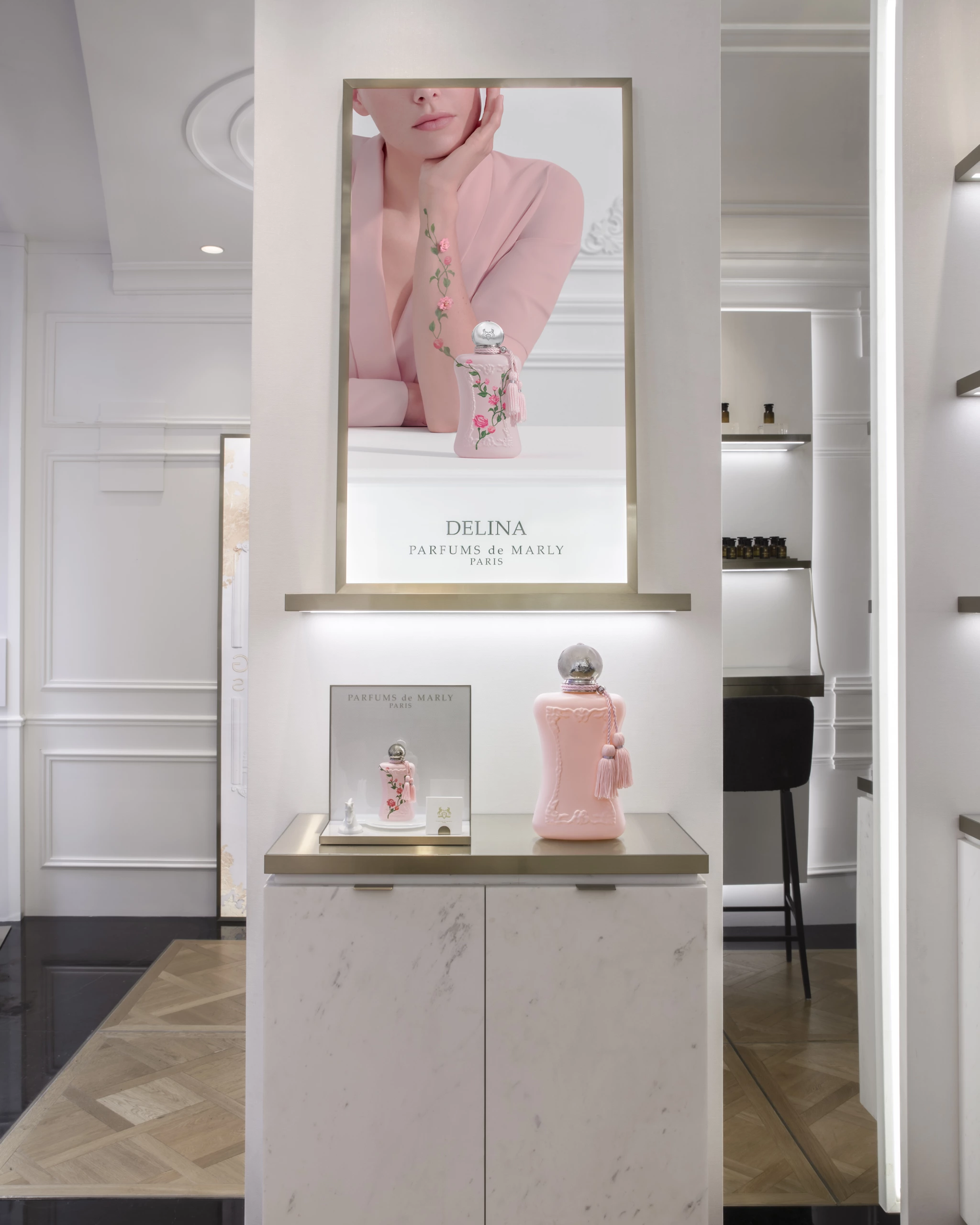 Photographing the Parfums de Marly window display for Delina, highlighting an elegant and feminine scenography.